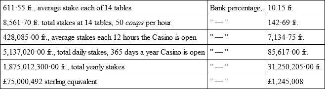 It is accordingly not necessary for the company to have recourse to underhand work as charged by Captain Weihe; the income of £1,245,008 realised without trickery, on an average stake per table would be 611·55 fr. Any one who has been at Monte Carlo will admit that this is probably very much below the average amount of money on the table at each spin of the wheel; and with such an income, where arises the occasion for illicitly supplementing it? The following is a table of stakes needed to realise the known profits of the company: