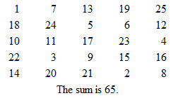 These nine ciphers are disposed in three horizontal lines; add the three ciphers of each line, and the sum is 15; add the three ciphers in each column, the sum is 15; add the three ciphers forming diagonals, and the sum is 15.