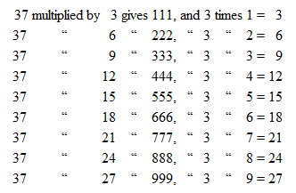 The number 37 has also somewhat remarkable properties; when multiplied by 3 or a multiple of 3 up to 27, it gives in the product three digits exactly similar. From the knowledge of this the multiplication of 37 is greatly facilitated, the method to be adopted being to multiply merely the first cipher of the multiplicand by the first multiplier; it is then unnecessary to proceed with the multiplication, it being sufficient to write twice to the right hand the cipher obtained, so that the same digit will stand in the unit, tens, and hundreds places.