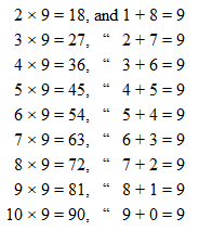It will be noticed that 9 × 11 makes 99, the sum of the digits of which is 18 and not 9, but the sum of the digits 1 × 8 equals 9.