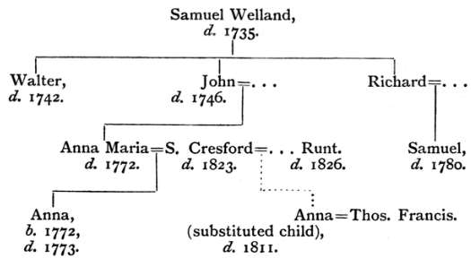 This substituted child grew up and inherited the Welland property and married a Mr. Francis, to whom the estate went after her death. There were no children. Here is the pedigree: —