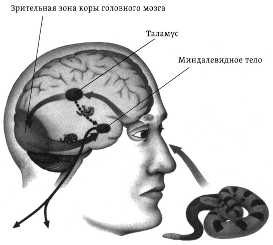 Зрительный сигнал от сетчатки глаза сначала проходит в таламус, где переводится на язык, понятный мозгу. Затем большая часть информации передается в зрительную зону коры больших полушарий головного мозга, где она анализируется, оценивается ее смысл и определяется, какая ответная реакция в данном случае наиболее уместна. Если потребуется эмоциональная реакция, то сигнал поступит в миндалевидное тело для возбуждения эмоциональных центров. В то же время меньший объем первоначального сигнала проходит по скоростному пути из таламуса прямиком в миндалевидное тело, обеспечивая более быструю (но менее точную) ответную реакцию. Таким образом, миндалевидное тело может в ответ на раздражитель выдать эмоциональную реакцию прежде, чем зоны коры головного мозга полностью осознают, что, собственно, произошло.