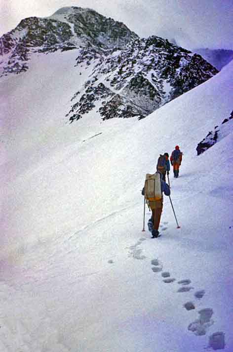 Нам удаётся выйти только в шесть часов. Солнце ещё не проникло в эту высокогорную долину. Перед нами высится ледопад, прикрытый снегом. Вершины Комито и Шаихкорт теряют утренний розовый цвет и слепят нас отражённым солнцем. Мы не спеша поднимаемся по так кстати оставленным вчера следам. За ночь они подмёрзли и превратились в отличные ступени. Я иду не торопясь, понемногу отстаю и оказываюсь последним. Проходим ледопад. К счастью, почти все трещины засыпаны снегом, и петлять не пришлось. Благополучно минуем нависающий справа лёд. Слева простирается терраса на леднике. Следы вчерашней группы ведут по гребешку, надутому параллельно перевалу, на вершину вправо. Тура там наши друзья вчера не нашли. Поднимаемся по гребешку и пересекаем склон с выходом на перевал. Снег слежался, и приходится выбивать ногами ступени.