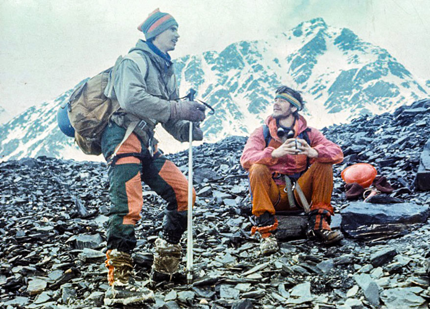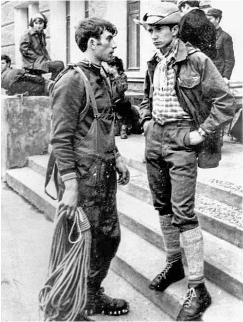 В. Щербаков (справа) и В. Роговской возле дворца спорта ГНИ перед выездом на восхождение