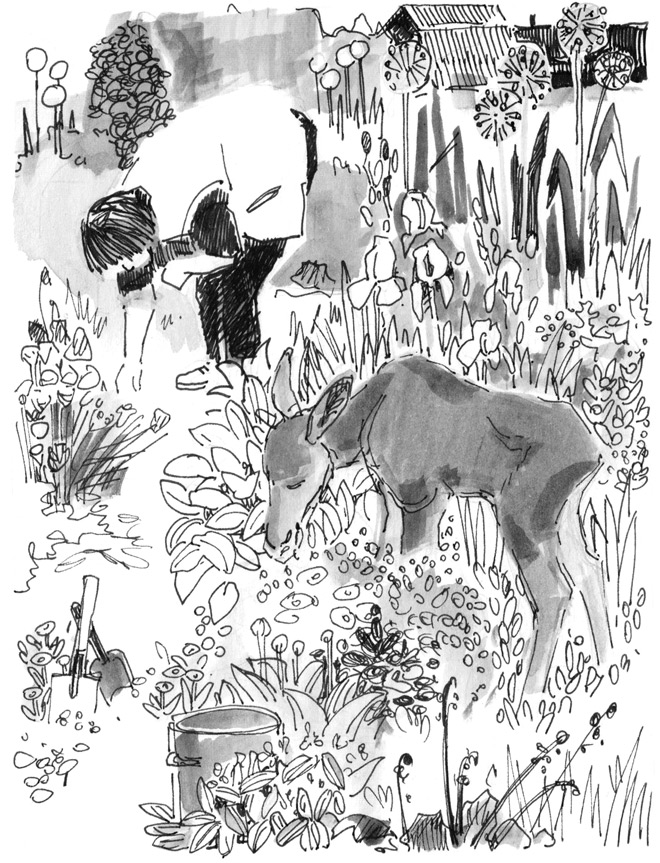 Трава стоит выше окон, ивовый кустарник непролазный. Верхушки на кипрее объедены (лосями). Жирные стебли лопухов, когда на них наступаешь, звонко, с хрустом лопаются.