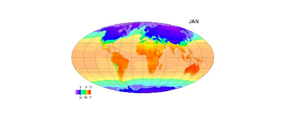 Климат. Среднемесячные температуры поверхности с 1961 по 1990 год. Это пример изменения климата в зависимости от расположения и времени года (Рисунок 4).