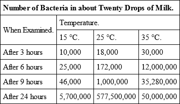 The sample of milk in question was found to possess on reaching the laboratory, two and a half hours after milking, a little over 9,000 bacteria in a cubic centimetre. The sample was divided into three portions, which were kept at different temperatures, and after definite intervals of time they were examined. The following table shows at a glance the results obtained: —