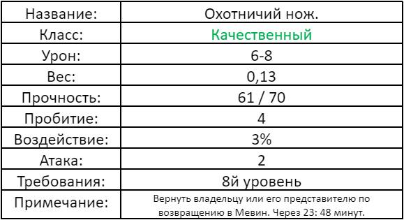 Оглядев своего проводника и телохранителя ещё раз, полурослик со вздохом отдал гоблину запасной нож, но только на время совместного похода. Посмотрев описание полученного оружия Карх обрадовался и загрустил одновременно. Параметры впечатляли, жаль, что максимум через сутки придётся расстаться с ним.
