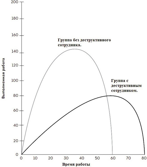 Всего один человек в команде, настроенный влиять на нее деструктивно, уменьшает результат группы почти наполовину, несмотря на то что остальные отдают работе все свои силы.