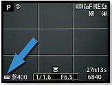 Trotz des Monitors, der einigen Strom benötigt, werden Sie in der Regel allerdings noch deutlich mehr Fotos schießen können, ehe der Akku leer ist. Der aktuelle Ladezustand des Akkus wird auf dem Monitor mit dem im Bild links markierten Symbol angezeigt.