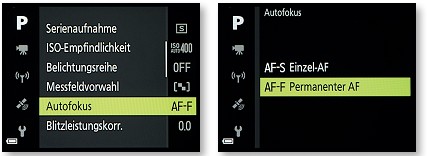 Auch die nächste Option – Autofokus – bietet eine nützliche Standardeinstellung an. Ist die Option AF-F Permanenter AF eingestellt, fokussiert die P900 automatisch, wenn sie eingeschaltet wird. Sie müssen den Auslöser dazu nicht antippen. Durch diese Option sind Sie schneller aufnahmebereit, weil die Kamera nur noch nachfokussieren muss, wenn Sie den Auslöser drücken.