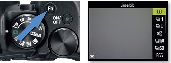 Die Funktionstaste, die Sie im linken Bild markiert sehen, dient standardmäßig zum Einstellen der Aufnahmebetriebsart. Sie sehen die Optionen im rechten Bild.