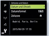 4 Mit der Zeitzone-Funktion wird die lokale Zeitzone ausgewählt. Mit dem Multifunktionswähler (rechts und links) verschieben Sie die Zone. Um die Sommerzeit zu aktivieren, drücken Sie in dieser Ansicht den Multifunktionswähler oben. Um sie wieder zu deaktivieren, muss er unten gedrückt werden. Bestätigen Sie die Änderung mit der OK-Taste.