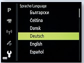 2 Drücken Sie den Multifunktionswähler rechts oder die OK-Taste, um in den rechten Bereich zu wechseln. Scrollen Sie dort zur Funktion Sprache/Language. Drücken Sie nach der Auswahl der Funktion die OK-Taste oder den Multifunktionswähler rechts, um die verfügbaren Optionen aufzurufen. Nach der Auswahl der Deutsch-Option wird die Angabe mit der OK-Taste bestätigt.