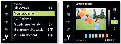Wenn Ihnen das Monitorbild oder Sucherbild der P900 zu dunkel oder zu hell erscheint, können Sie die Monitor-Funktion auf der System-Registerkarte aufrufen – das ist die letzte Registerkarte. Sie sehen dann das nachfolgend links gezeigte Untermenü. Im Untermenü lässt sich die Helligkeit getrennt für den Monitor und das Sucherbild einstellen. Dazu dienen die Funktionen Monitoroptionen und EVF-Optionen. Die zweite Option ist nur verfügbar, wenn Sie in den Sucher schauen.