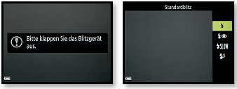 Wenn Sie den Blitz nutzen wollen, müssen Sie ihn zunächst aufklappen – er wird nicht automatisch aufgeklappt. Bei den Motivprogrammen erhalten Sie einen entsprechenden Hinweis, wenn der Blitz zugeschaltet werden soll – Sie sehen dies im linken Bild auf der nächsten Seite. Verwenden Sie zum Aufklappen die im Bild rechts markierte Taste. Nach dem Drücken wird der kleine Blitz recht weit nach oben hochgeklappt. Zum Deaktivieren des Blitzes drücken Sie ihn einfach wieder nach unten, bis er einrastet.