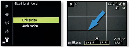 Die Option Gitterlinien ein-/ausbl. im Monitor-Untermenü sollten Sie aktivieren, da sie bei der Ausrichtung der Kamera hilfreich sind. Besonders bei Architektur- oder Landschaftsaufnahmen sind die Gitterlinien nützlich. So vermeiden Sie unschöne schiefe Horizonte, die Bilder schnell unansehnlich machen.