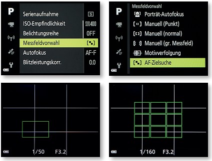 Mit der Funktion Messfeldvorwahl im Aufnahme-Menü stellen Sie die Art der Fokussierung ein. Standardmäßig ist die Option AF-Zielsuche aktiviert. Dabei analysiert die Kamera das Bild und stellt auf das erkannte Objekt scharf. Werden Gesichter erkannt, wird auf diese fokussiert. Da diese Automatik recht zuverlässig arbeitet, spricht nichts dagegen, diese Standardvorgabe beizubehalten. Erkennt die P900 kein Objekt, werden automatisch eines oder mehrere der neun Autofokusmessfelder gewählt, in dem/denen sich das Motiv am nächsten zur Kamera befindet, und darauf scharf gestellt. Sie sehen dies in der unteren rechten Bildmontage – links ist ein erkanntes Objekt simuliert.