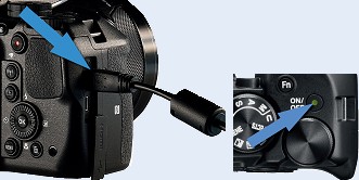 Verbinden Sie nun das mitgelieferte Netzteil mit dem Stromnetz. Anschließend muss die ausgeschaltete Kamera über die Micro-USB-Schnittstelle mit dem Netzteil verbunden werden. Der Micro-USB-Anschluss ist der obere Anschluss auf der rechten Kameraseite – er ist in der Abbildung unten links markiert. Während der Akku auflädt, blinkt die Kontrolllampe in der Mitte des ON/OFF-Schalters langsam. Leuchtet die Kontrolllampe dauerhaft, ist der Akku vollständig aufgeladen. Blinkt die Lampe schnell, wurde der Ladevorgang unterbrochen – nehmen Sie in diesem Fall den Akku heraus und setzen Sie ihn erneut ein. Wenn die Umgebungstemperatur zu heiß oder zu kalt ist, könnte der Ladevorgang beispielsweise unterbrochen werden.