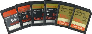 Die SD-Speicherkarten (Secure Digital) sind recht klein. Sie sind auf kleinere Kapazitäten – bis etwa 4 GByte – ausgerichtet. Die neueren SDHC-Karten (Secure Digital High Capacity) erhalten Sie aktuell in höheren Kapazitäten von bis zu 32 GByte, wobei 16-GByte-Karten (je nach Geschwindigkeit) um etwa 30 Euro kosten. Die noch neueren SDXC-Karten (Secure Digital eXtended Capacity) erlauben noch größere Kapazitäten bis hin zu 2 TByte und bieten höhere Übertragungsgeschwindigkeiten.