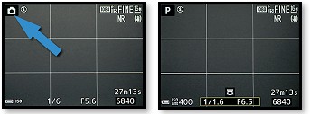 Welches Belichtungsprogramm Sie aktiviert haben, sehen Sie anschließend oben links auf dem Monitor. Ich habe im folgenden Bild das Symbol der Vollautomatik markiert. Rechts wurde die Programmautomatik eingestellt.