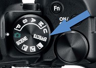 Mit dem im Bild markierten Moduswahlrad wird die gewünschte Belichtungsautomatik eingestellt. Neben der grün markierten Vollautomatik können Sie auch zwischen der Programm-, Blenden- oder Zeitautomatik sowie dem manuellen Modus wählen. Zudem gibt es den SCENE- und EFFECTS-Modus zur Auswahl von Motivprogrammen und Effekten.