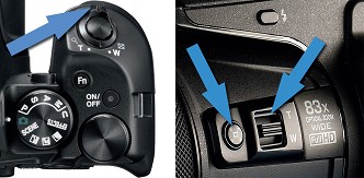 Um die Brennweite zu verändern, benötigen Sie den Zoomhebel, der vorne am Auslöser angebracht ist. Wollen Sie Weitwinkelaufnahmen machen, drücken Sie den Hebel nach links. Wurde die Kamera übrigens gerade eingeschaltet, ist standardmäßig die kürzeste Brennweite eingestellt. Soll an die Szene herangezoomt werden, muss der Hebel nach rechts gedrückt werden, bis der gewünschte Bildausschnitt erreicht ist. Alternativ können Sie auch den Zoomschalter nutzen, den Sie links am Objektiv finden. Sie sehen ihn in der rechten Abbildung.