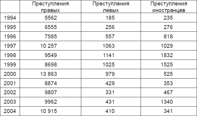 С 1994 по 2004 год, т. е. за 11 лет, в ФРГ были возбуждены 117 344 судебных дела по политическим мотивам, в том числе 101 310 против «правых экстремистов», 6807 против «левых экстремистов» и 9227 против «иностранных экстремистов», таких как приверженцы сепаратистской курдской партии ПКК. Эта статистика выглядит следующим образом[10]: