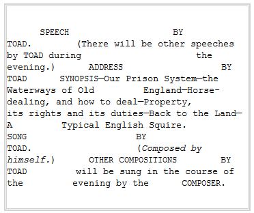 " – Let me sing you a little song," went on the voice, "which I have composed on the subject of Toad" – (prolonged applause).