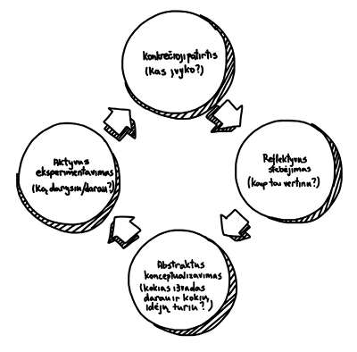Pavyzdžiui, jei neseniai darbavotės su grupe, greičiausiai supratote, ką darote ne taip. Šis supratimas – tai patirties įvertinimas (Kas įvyko?). Vėliau jūs apgalvojote šią patirtį (Kaip aš tai vertinu?), padarėte išvadas (Ką galima daryti kitaip?) ir kitą kartą nekartosite klaidų – darysite geriau (Ką darysiu / darau?). Visa ši seka – tai tam tikras ciklas, kuris apima jūsų patyrimą ir šio patyrimo apmąstymą. Atlikę tai, jūs darote išvadas, formuluojate idėjas ir pagaliau imatės veikti kitaip nei anksčiau.