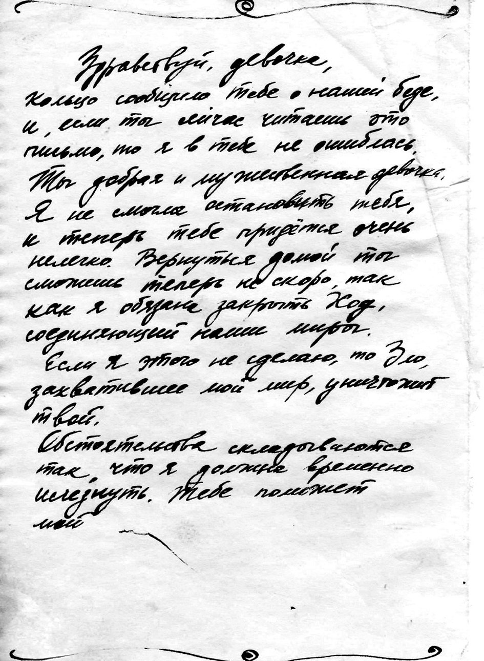 Осторожно, будто опасаясь, что от её прикосновения записка может исчезнуть, девочка взяла её в руки и развернула. – Здравствуй, девочка, – прочитала она. – Записка предназначалась ей! – взволнованно подумала Маня и её сердце тревожно забилось.