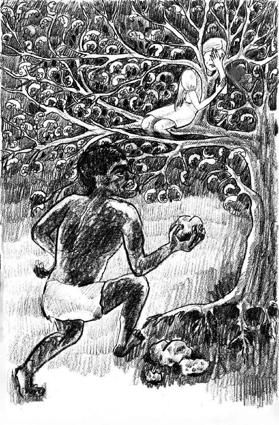 Заблуждаться в его намерениях не приходилось, и Маня, содрогаясь от отвращения при виде его зверских гримас, переборола цепенящий её душу страх и бросилась в лес. Она бежала изо всех своих сил, а Одноухий неспешными прыжками мчался за ней, играя, как кот с мышью. Наконец, игра ему надоела, и он решительно двинулся вперёд. Расстояние между ними катастрофически сокращалось, и вот уже Маня оказалась перед ним лицом к лицу, задыхаясь от бега и охватившего её гнева. На мгновение её презрительный взгляд, брошенный, как вызов глаза в глаза, смутил дикаря, и он даже слегка попятился, но, овладев собой, сделал решительный прыжок. Отпрянув назад, Маня нащупала за собой ствол дерева и, обернувшись, стремительно полезла по нему вверх.