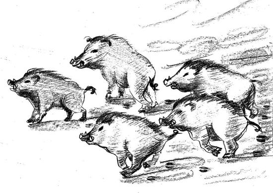 Топот, между тем, раздавался всё ближе и ближе. Девочка явно различала чьё-то хрюканье и треск веток. Через секунду на тропу выскочило стадо злобных диких свиней. Это не было мирно пасущееся стадо, переходящее с места на место в поисках пищи. Кто-то или что-то напугало животных и привело в бешенство. А ведь ничего нет более опасного, чем взбесившееся стадо диких кабанов. Тогда они мчатся вперёд, не разбирая дороги, сметая всё живое со своего пути. Даже слоны стараются избегать встречи с ними.