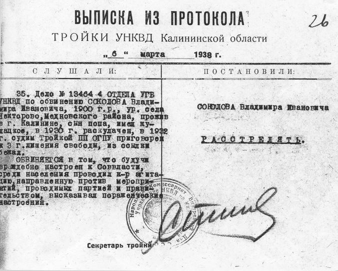 Ответ. Мой отец, Соколов Иван Гаврилович, по окончании Духовной семинарии в 1890-х годах и до 1921 года, то есть по день смерти, являлся служителем религиозного культа – священником. Лично я служил псаломщиком в селе Прудово Рамешковского района с 1920 по 1929 год. В 1929–1930-х хозяйство моё из-за невыполнения твёрдого задания раскулачено. В начале 1930 года я переехал на жительство в город Калинин. В Калинине мне приходилось работать в разных местах. Около двух лет я работал на станции Калинин грузчиком, около двух лет работал дворником Вознесенской церкви в Калинине. И с 1935 года по октябрь 1936-го я занимал должность писаря архиепископа Фаддея (Успенского И. В.), и в настоящее время работаю в «Калининстрое» кассиром.