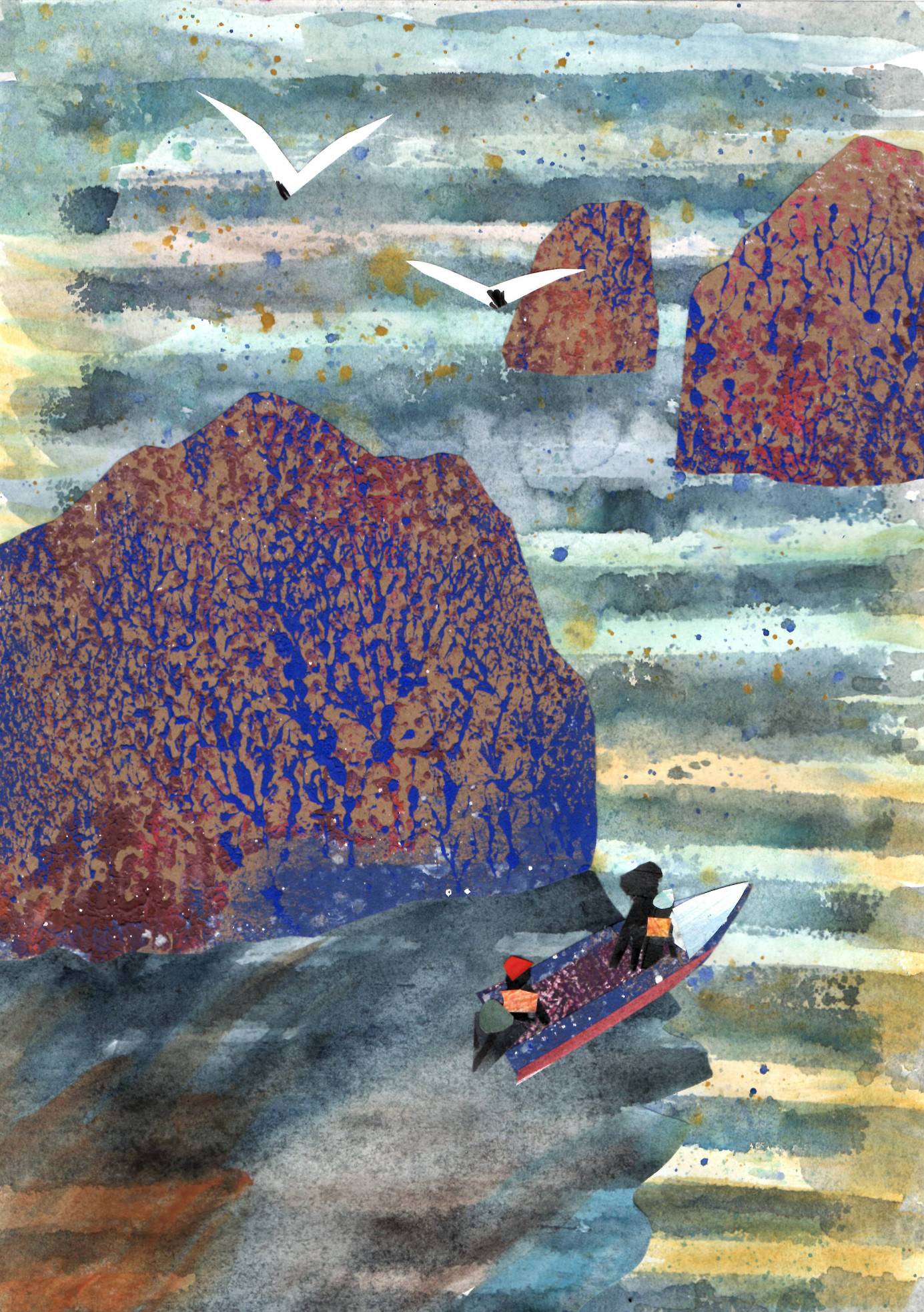 Тем временем Саша прогуливалась по берегу с Платоном, и тот увлеченно рассказывал, как погода и температура воды влияют на медуз. Неожиданно Саша заметила, что одинокая скала недалеко от берега очень похожа на ту, что они видели в волшебном зеркале. Саша задумалась, и перед глазами пронеслось видение: лодка подплывает к скале с тремя пассажирами, они высаживаются, а лодку сильный ветер относит в море, начинается шторм…Как они спасутся? Что будет дальше? Надо рассказать бабушке!