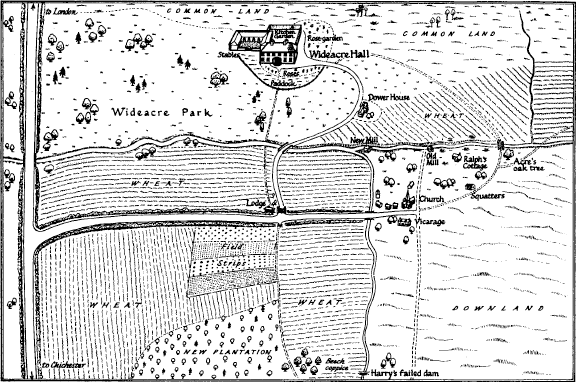 To our right lay the dozen cottages of Acre village, whitewashed and snug. The vicarage, the church, the village green and the broad, spreading chestnut tree that dominates the heart of the village. Beyond them, in miniature size like crumpled boxes, were the shanties of the cottagers who claimed squatters’ rights on the common land. Their little hovels, sometimes thatched with turf, sometimes only a roofed-in cart, were an eyesore even from here. But to the west of Acre, like a yellow pearl on green velvet, amid tall, proud trees and moist, soft parkland, was Wideacre Hall.
