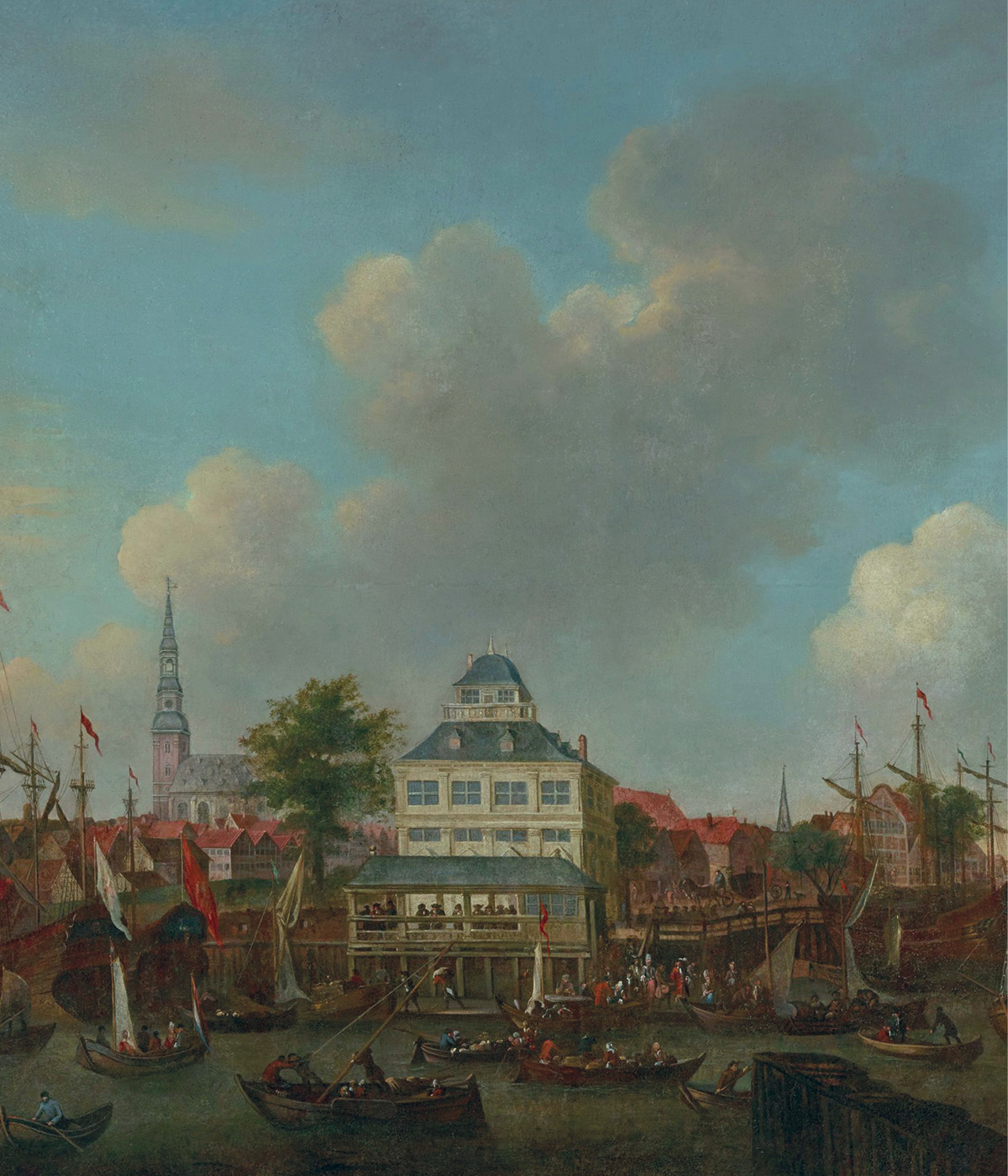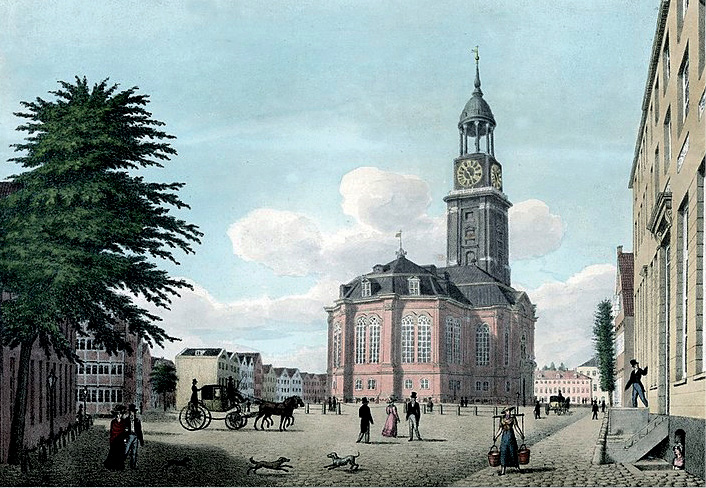 So wie auf dem berühmten Gemälde von Johann Georg Stuhr (Ausschnitt) dürfte der Hafen auch noch Mitte des 18. Jahrhunderts ausgesehen haben, als Johann Laeisz nach Hamburg kam. Zunächst fand er Arbeit beim Wiederaufbau der durch Blitzschlag zerstörten Michaeliskirche (rechts).