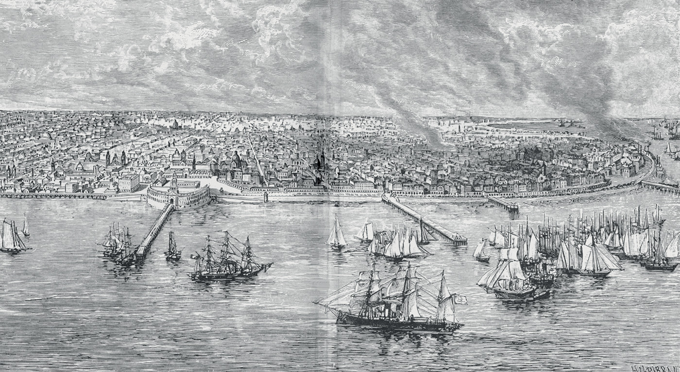 Der Hafen von Buenos Aires im 19. Jahrhundert. 1825 exportierte Laeisz erstmalig Zylinderhüte in die argentinische Hauptstadt.