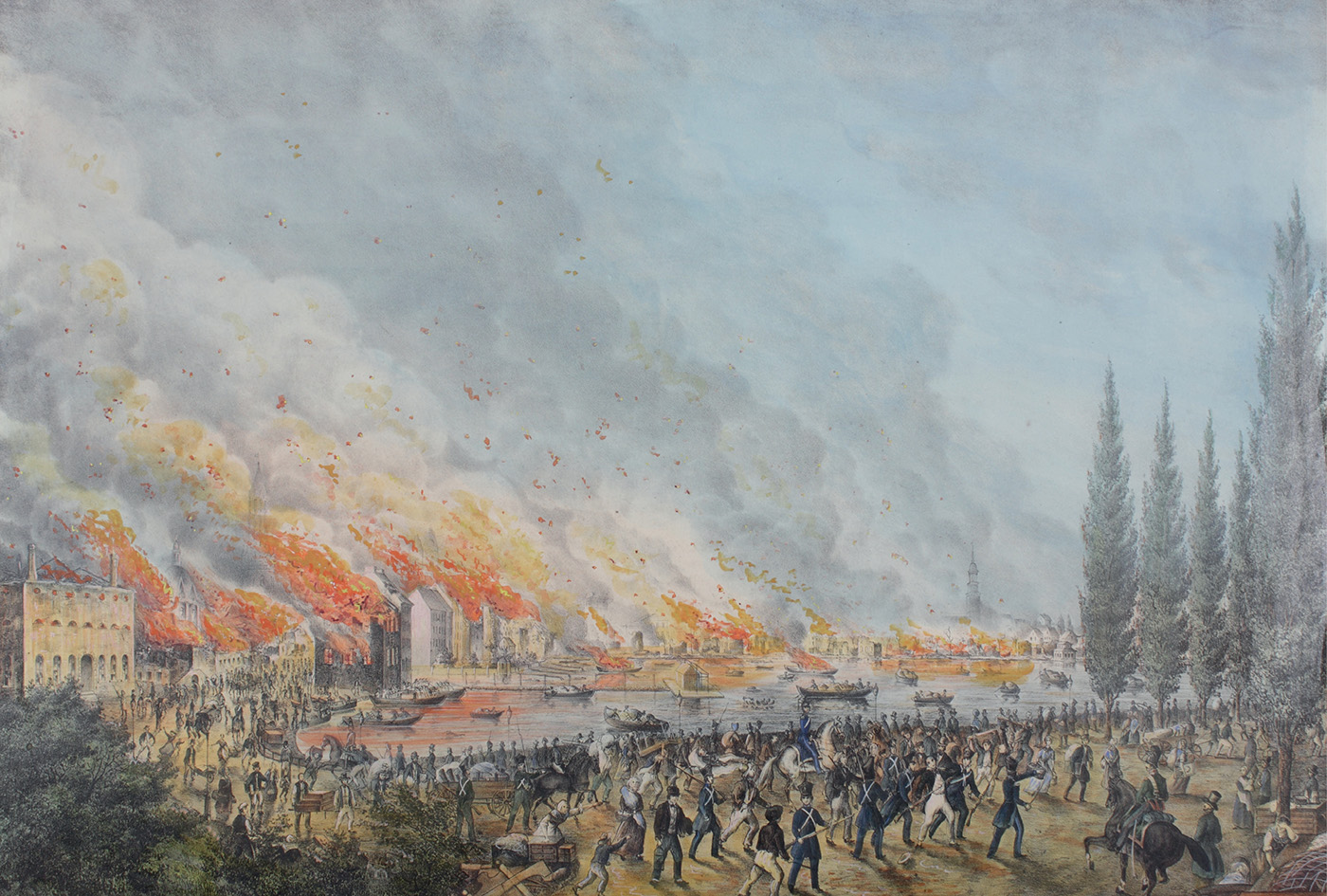 Die CARL liegt gerade in Hamburg und soll eigentlich wieder nach Südamerika auslaufen, als der Große Brand am 5. Mai 1842 in einem Haus an der Deichstraße ausbricht und weite Teile der Hansestadt vernichtet. Warenlager und Kontorhaus der Firma Laeisz liegen auf der Marschinsel Grimm im Mündungsgebiet der Alster in die Elbe, nur unweit vom Brandherd entfernt. Als das Feuer ausbricht, reagiert Ferdinand Laeisz schnell, couragiert und weitsichtig. Er trommelt seine Leute zusammen und lässt die wertvollen Güter, die übrigens nur unzureichend versichert sind, in Windeseile auf Schuten laden und so in Sicherheit bringen. Außerdem funktioniert er kurzerhand Rumfässer in Löschkübel um, die immer wieder aufs Neue mit Winden ins Dachgeschoss gezogen werden, von wo aus die Angestellten das Kontorhaus gegen die Flammen verteidigen – und das Nachbarhaus, dessen Bewohner zuvor in Panik geflohen sind, gleich mit. So bleibt die Firma von Verlusten verschont und ihr Besitzer gewinnt weiter an Ansehen. Dank seiner guten Südamerikakontakte wird er Konsul der Republik Peru und gehört damit ohnehin zu den Honoratioren der Hansestadt.