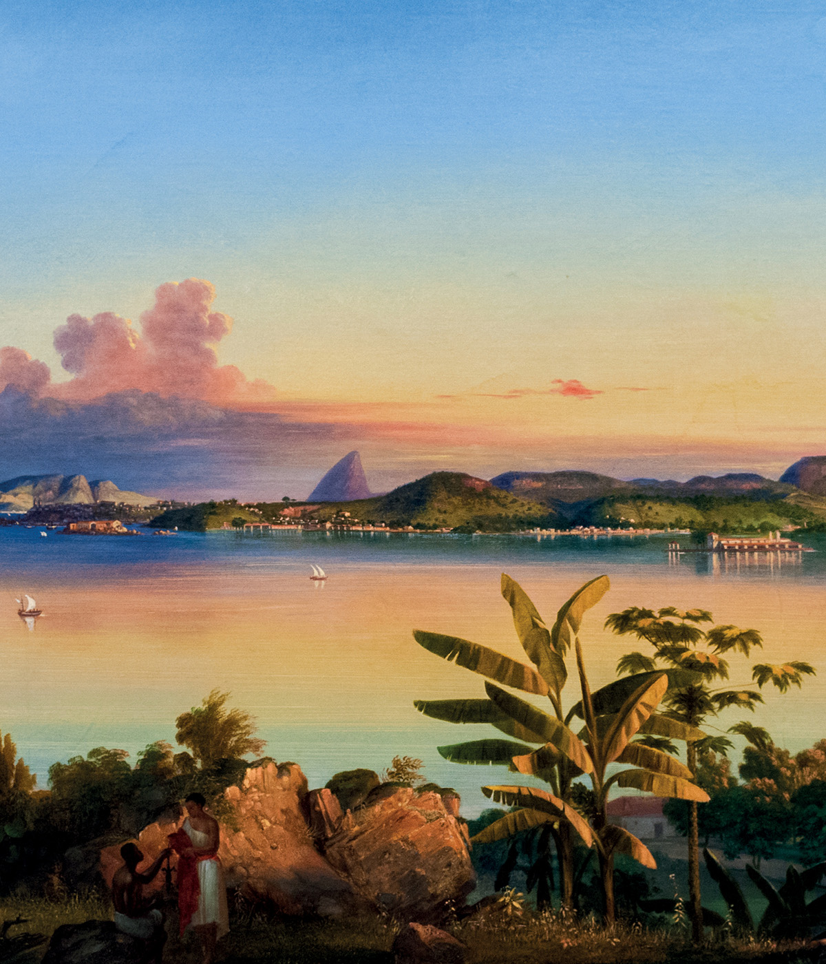 Das erste Reiseziel der Brigg CARL ist Rio de Janeiro, hier auf einem Gemälde des brasilianischen Malers Alessandro Cicarelli aus dem Jahr 1844 (Ausschnitt). Zur Ladung gehören Zylinderhüte, die bei modebewussten Herren Mitte des 19. Jahrhunderts enorm begehrt sind.