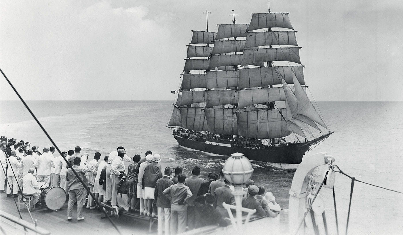 Begegnung auf dem Südatlantik: Für die Passagiere des Luxusdampfers CAP ARCONA war es faszinierend, die PEKING unter vollen Segeln vorüberziehen zu sehen. Das Bild entstand wahrscheinlich 1929.