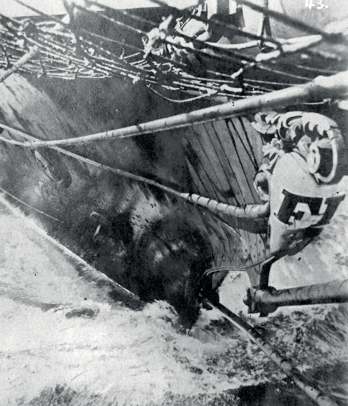 Die PEKING ist in traurigem Zustand, als sie auf der Caddell-Werft in Staten Island für den Transport im Dockschiff vorbereitet wird.