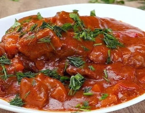 Нам понадобится:700 гр. Говядины, нарезанной крупными кусками;1 банка помидор в собственном соку;2 ст. л. Сладкой паприки;2—3 луковицы, нарезанные кубиками;1 зубчик чеснока мелкорубленный;500 гр. Воды;1 ст. л. Муки;Оливкового масла;Цедра половинки лимона;1 ст. л. Винного белого уксуса;1 щепотка орегано;2 щепотки тмина;1 ч. л. Сахара;Соль и черный молотый перчик.
