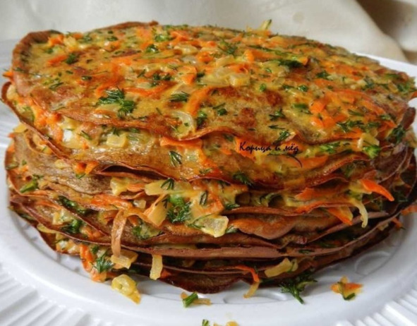 Каждый слой между блинчиками промазываем майонезом и обжаренными овощами. Также поступаем и с верхним слоем. Украшаем зеленью. Отправляем в холодильник на 2—3 часа.
