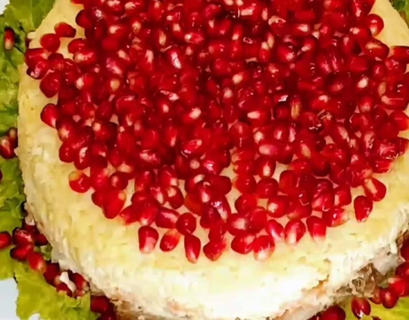 Нам понадобится:250 гр. Отварной говядины, нарезанной кубиками;150 гр. Сыра, натертого на терке;2 отварных яйца, натертые на терке;1 морковь, натертая на терке;Половинка луковицы;Горсть грецких орехов;Майонез;Зерна граната;По 1 ч. л. Сахара и уксуса;Щепотка соли.