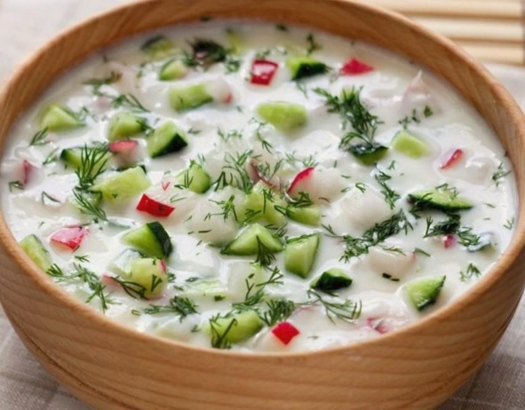 Нам понадобится:2—3 куриных грудки, нарезанных кубиками;2 отварных яйца, одно из которых нарезанное кубиками, второе натертое на терке.2 отварные картофелины, нарезанные кубиками;4 свежих огурца, натертых на терке;5 редисок мелкорубленных;Зелень укропа, петрушки и лука мелкорубленная;Кефир;Газированная вода.