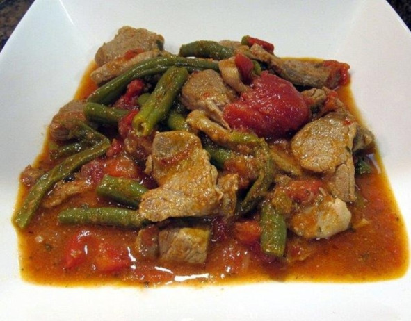 Свинина, тушеная с овощами и стручковой фасолью в томатном соусе
