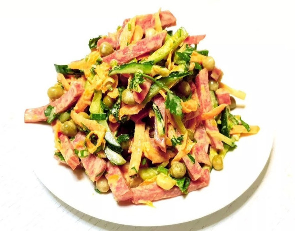 Нам понадобится:150 гр. Копченой колбасы, нарезанной тонкой соломкой;1 свежий огурец, нарезанный тонкой соломкой;150 гр. Твердого сыра, нарезанного тонкой соломкой;100 гр. Моркови по-корейски;200 гр. Консервированной кукурузы;50 гр. Сухариков;1—2 дольки чеснока, пропущенных через пресс;Майонез;Соль и черный молотый перчик – по вкусу;Зелень укропа мелкорубленная.