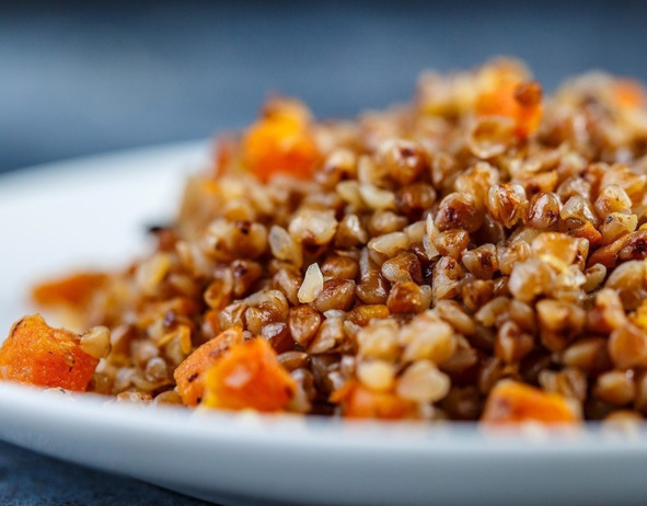 Морковь и лук нарезаем и обжариваем до золотистого цвета. Затем добавляем их к гречке и слегка обжариваем всё вместе. После этого выключаем огонь и накрываем кастрюлю крышкой.