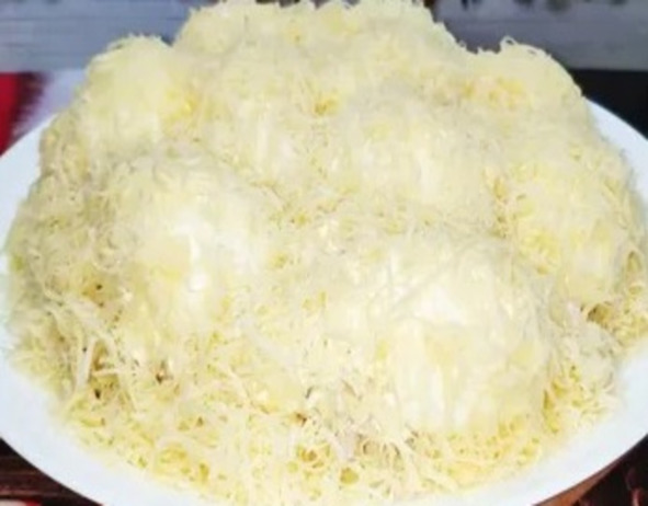 Пятый слой – белки, из которых предварительно удалены желтки. Желтки смешиваются с горчицей и чесноком, слегка подсаливаются. Полученная смесь аккуратно помещается внутрь белков. Эти белки с начинкой укладываются на пятый слой.